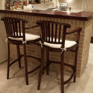 Классический вариант. Он основан на высоких консолях, барная стойка имеет около полутора метров в высоту и именно поэтому к ней идеально подойдут высокие барные стулья со спинками.