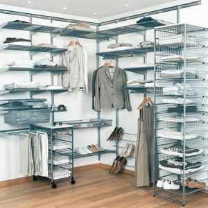 Металлические составляющие и фурнитура фабричного производства для гардеробных-стеллажей дороги, если покупать их в специализированных магазинах. Однако, если есть руки, всегда можно что-то изготовить самостоятельно, чтобы сэкономить. Например, для оформления откосов подойдут куски металлического прута диаметром 5-6 мм. Плюс ТУТы — термоусаживаемые изоляционные трубки, изготавливаемые из разноцветного прочного полиизопропилена. «Насаживается» одно на другое путем нагревания (70-80°С). Получается достаточно прочная конструкция, и внешне эстетичная.