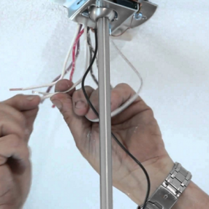 Если стержень несъемный, куски лески в отверстия вводятся поочередно, начиная с нижнего. И точно также надо поступить с проводами. Цель такой доработки люстры — вывести провода сбоку, чтобы они не оказались прижатыми к потолку и продавленными стержнем.