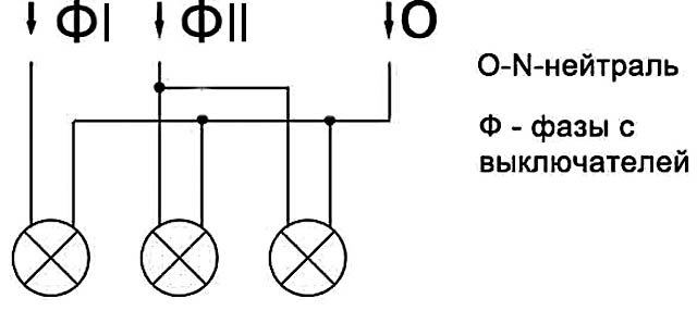 Согласно схеме и закону Ома, если сопротивление одной такой лампочки равно R, то между нулем и ФI будет тоже R. Между нулем и ФII уже 0,5 R. А между фазами — 1.5 R.