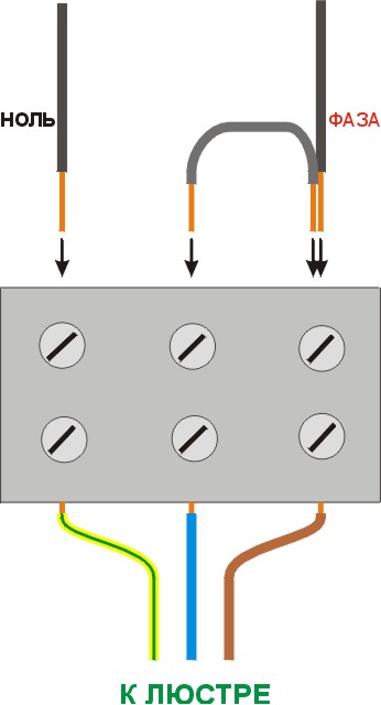 Если провода в люстре не маркированы и клеммник отсутствует, придется светильник прозванивать. Только ни в коем случае не лампочкой-контролькой от сети! Это опасно для жизни! Чтобы прозвонить люстру, необходимо ввернуть одинаковые (и по марке, и по мощности) маломощные лампы (15-25 Вт):