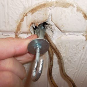 Потолочный крюк. Этот способ самый старый из применяющихся и одновременно самый простой и надежный. Он потребует от монтажника лишь крепкого потолка, да нехитрого крепежного приспособления в нем.