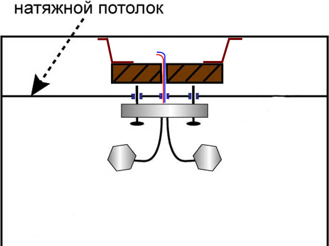 И третье: прежде, чем вызывать монтажников, придется подготовить крепление для люстры. Ведь штатное в большинстве случаев не годится для установки в натяжные потолки. Так что, если это будет крюк, его придется подготовить заранее. А если крепить на планки или двутавр, надо будет прикрепить «подушку» из фанеры или МДФ (от 16 мм толщиной) на кронштейны: